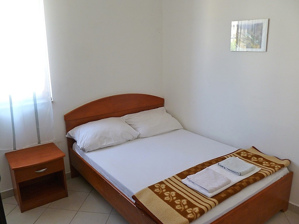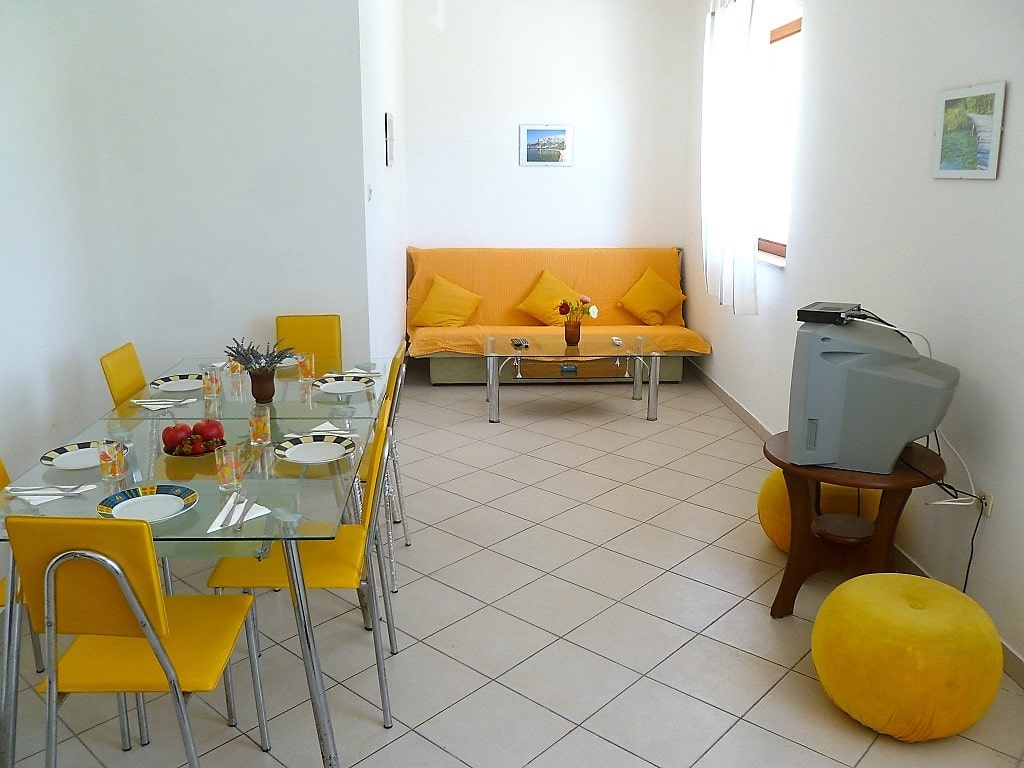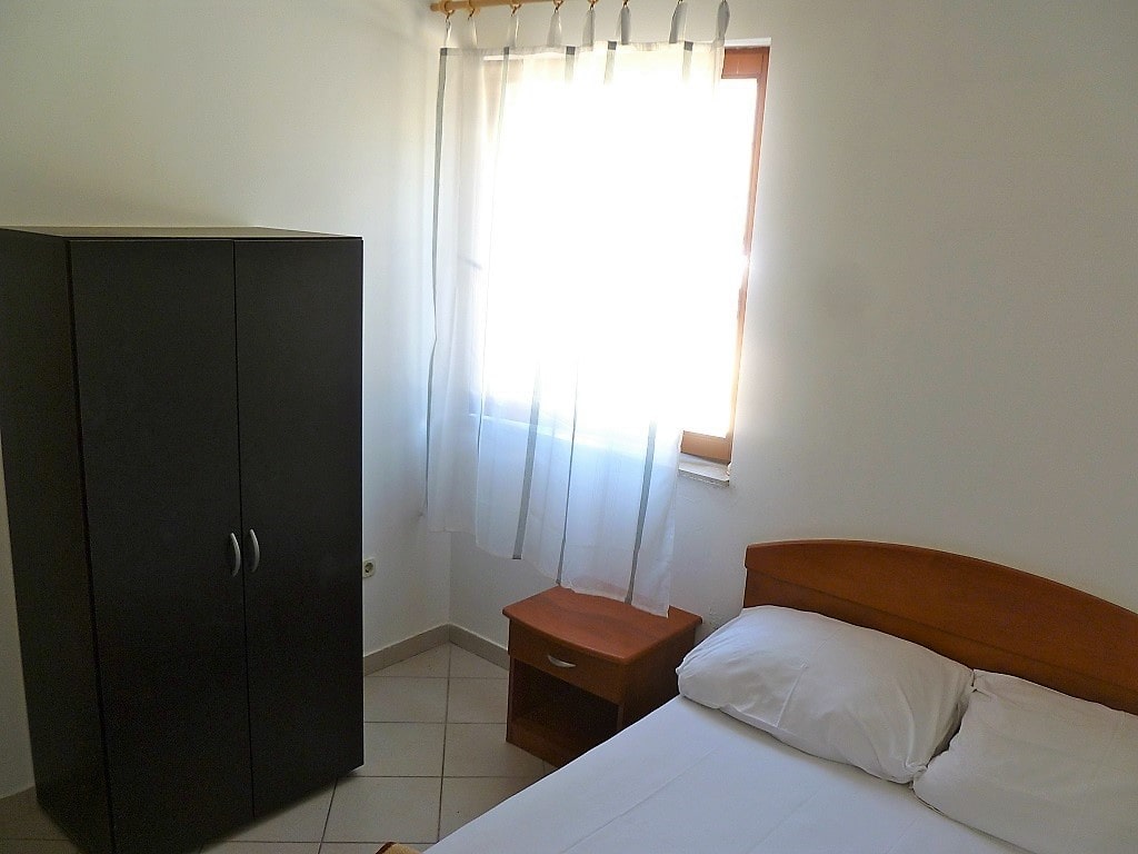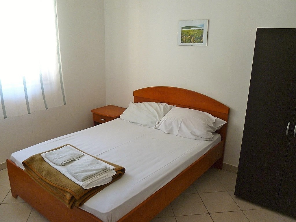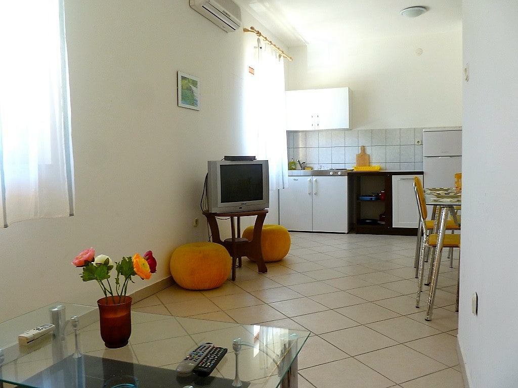 Big apartment A (6+2) without balcony has 3 bedrooms + living room with kitchen. In 2 bedrooms there are 2 double beds and in 3ed bedroom there are 2 single beds. All together 6 + 2 additional in living room (big couch). Apartment has air condition, sat TV, kitchen (fridge with all dishes necessary for cooking) and bathroom with shower.