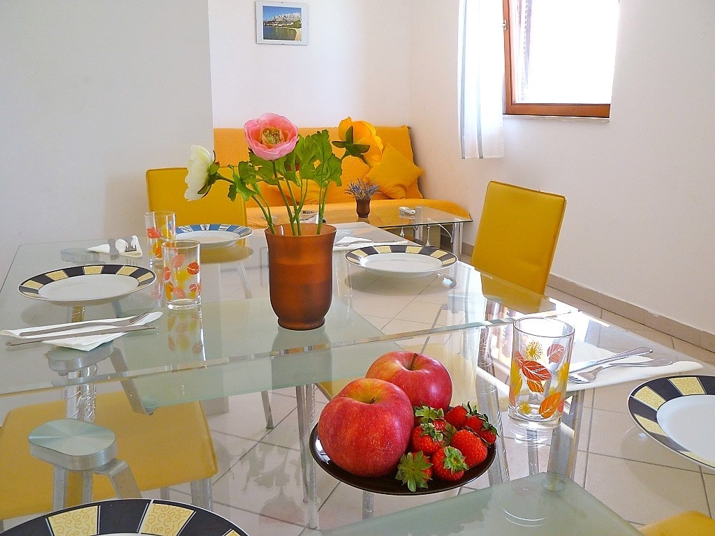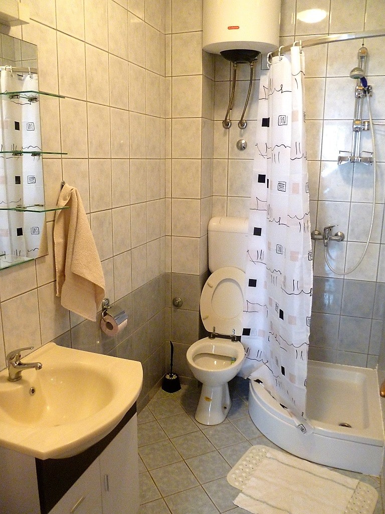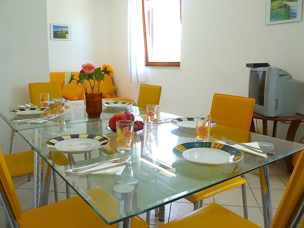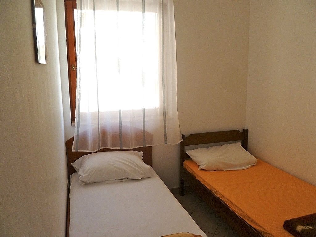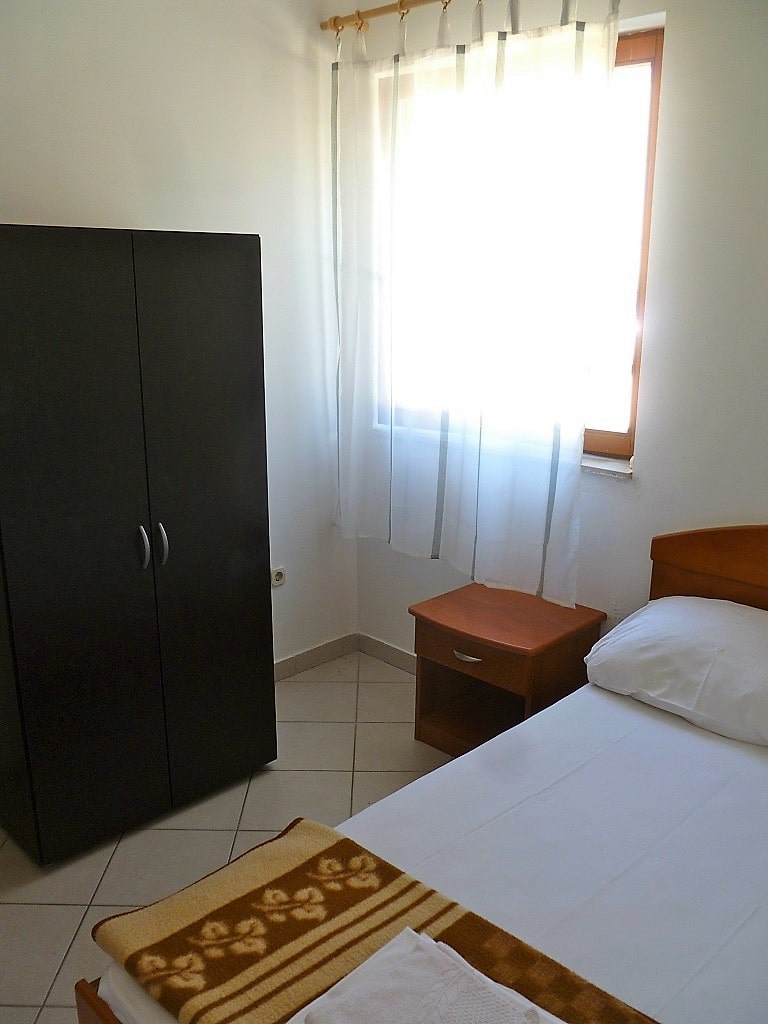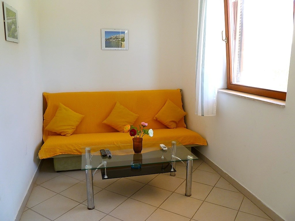 Big apartment A (6+2) without balcony has 3 bedrooms + living room with kitchen. In 2 bedrooms there are 2 double beds and in 3ed bedroom there are 2 single beds. All together 6 + 2 additional in living room (big couch). Apartment has air condition, sat TV, kitchen (fridge with all dishes necessary for cooking) and bathroom with shower.