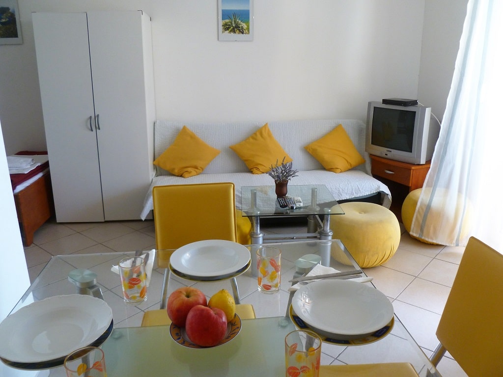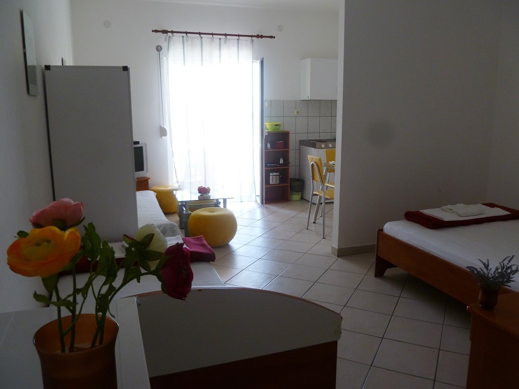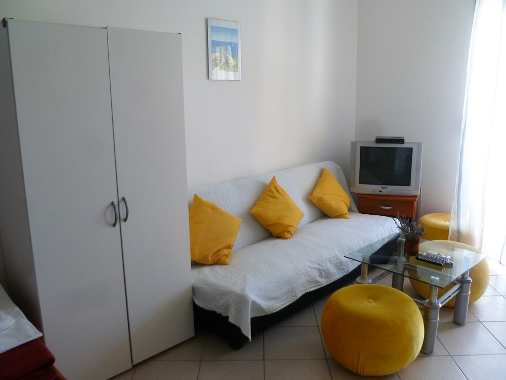 Studio-Apartment bedeutet, dass alles in einem Raum ist - 35 m2 (1 Doppelbett, 1 Einzelbett und 1 Sofa), Küche (mit Kühlschrank und Geschirr zum Kochen) + Badezimmer mit Dusche. Die Wohnung verfügt über Klimaanlage, Sat-TV, und Parkplätze sind gesichert (neben dem Haus).