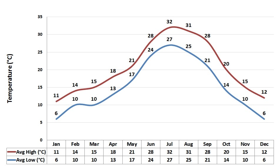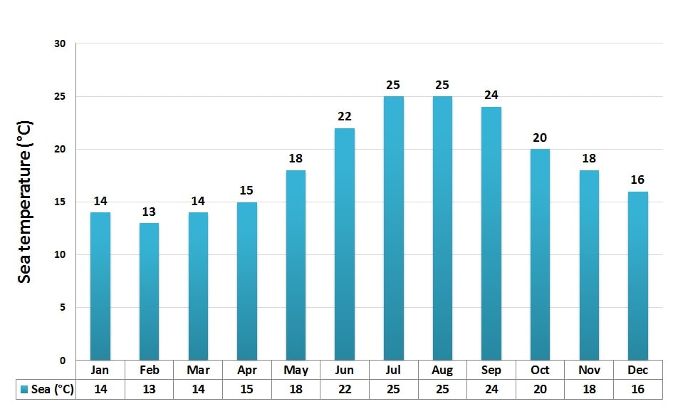 Poniżej znajduje się grafika ze średnią maksymalną i minimalną dzienną temperaturą powietrza i temperaturą wody w Primošten, która najlepiej odzwierciedla przyjemny śródziemnomorski klimat.